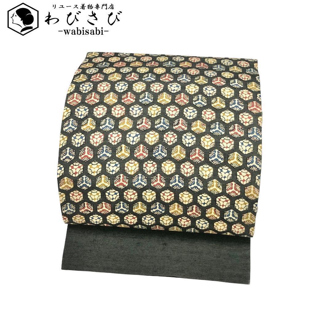 > 名古屋帯 紬 型染 六角形に花柄模様 青柳鼠色 O-5108 着物 きもの kimono 和服 和装 中古 リサイクル着物 【送料無料】