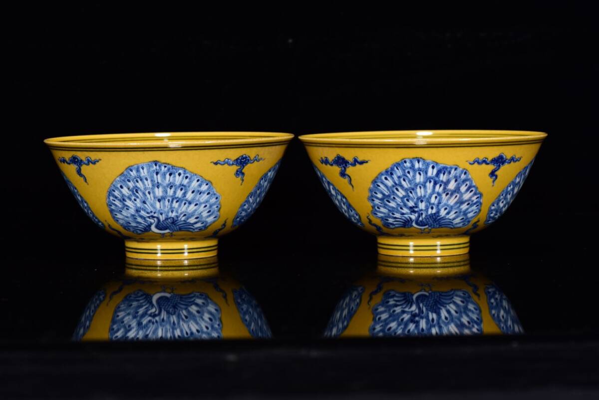 - 【超珍館蔵】明 成化年製款 古陶瓷品 黄釉 青花 孔雀紋 供碗一對 陶藝 古賞物 古董品 古美術品 時代物 旧家蔵出 稀少珍蔵品