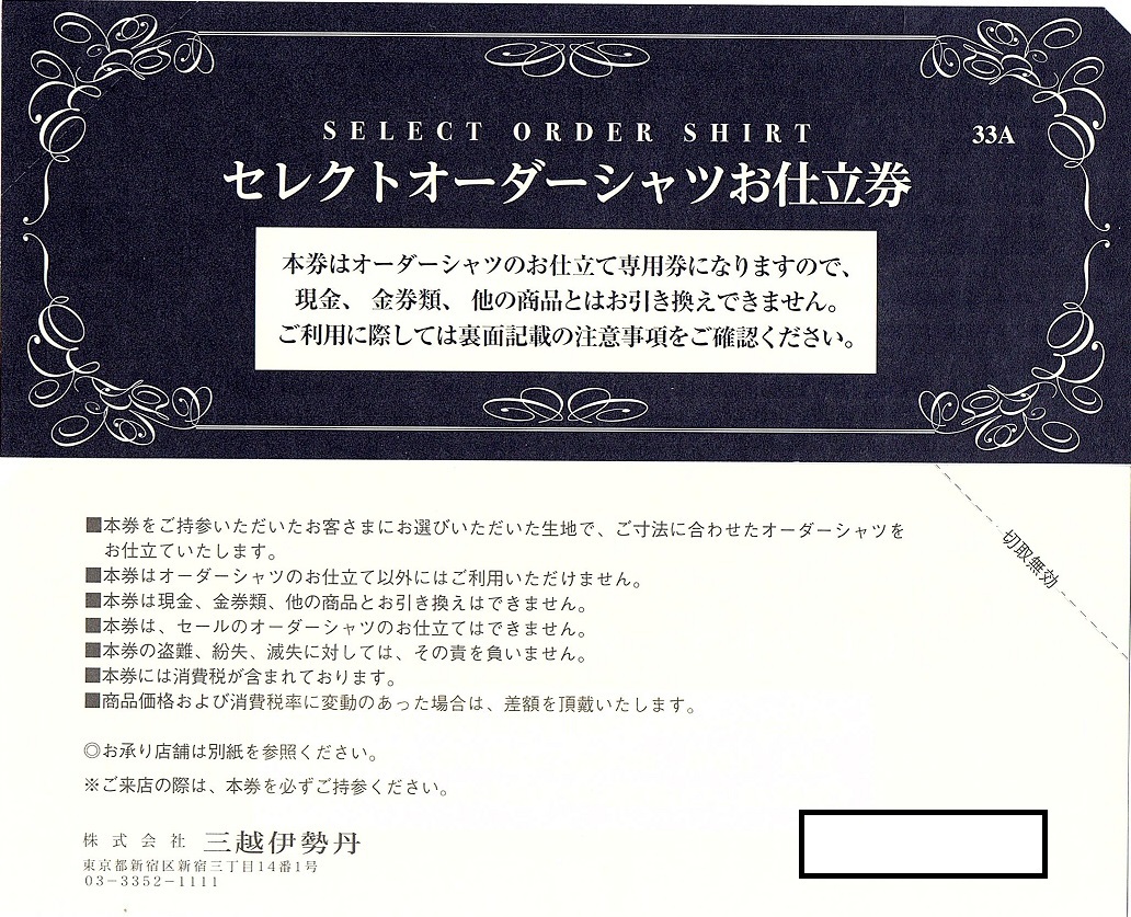 > 三越伊勢丹 セレクトオーダーシャツお仕立券 30000円(税別)1枚(単位) ~2枚迄 ※33000円相当