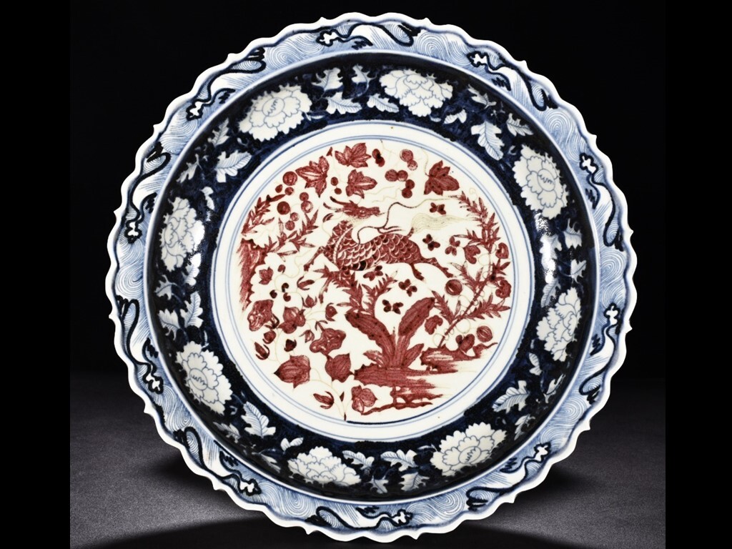 - TB135■中国古玩 唐物 元時代 青花釉里紅 麒麟蕉葉紋 葵口折沿盤 時代物 極上品■高さ8cm・直径44.5cm■