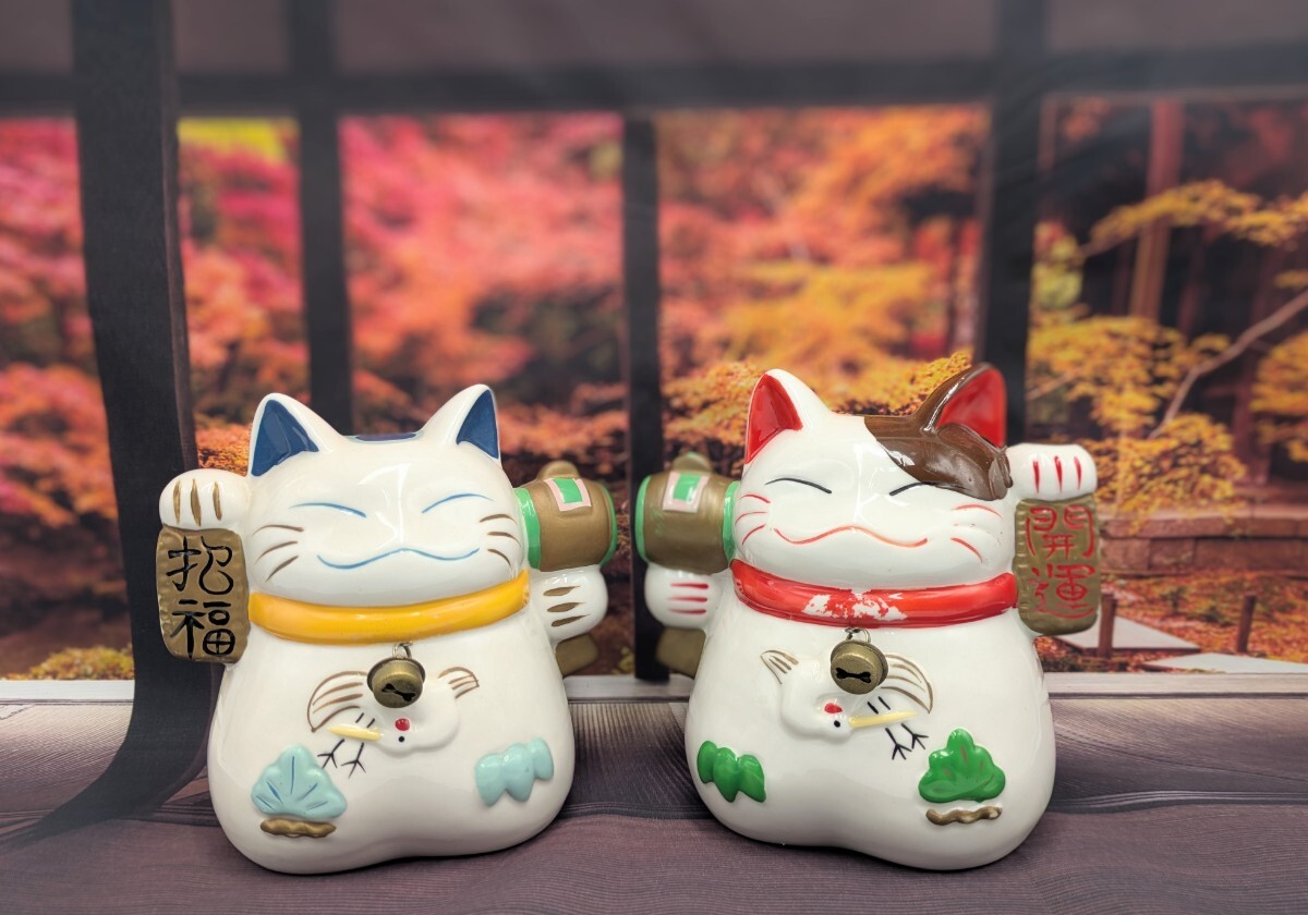 - 招き猫 陶器製 貯金箱 2個セット 招福開運 ペア 昭和レトロ 縁起物 商売繁盛