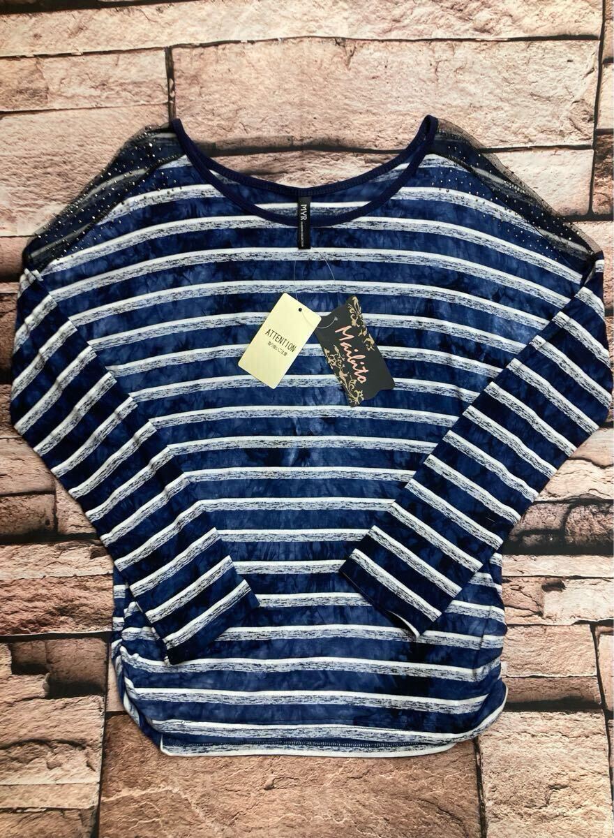 - 送料無料!サイドギャザー 肩ラインストーン&シースルー ボーダー柄 綿混デザインTシャツ1枚4,290円が
