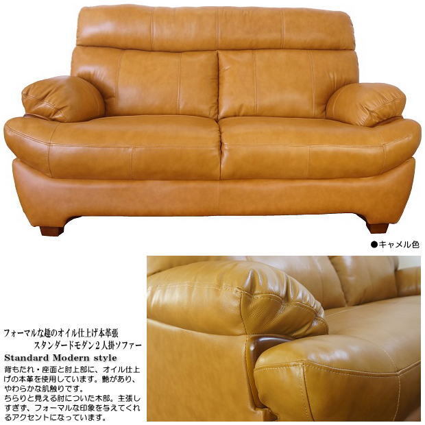 > フォーマルな趣のオイル仕上本革張スタンダードモダン2人掛けハイバックソファー キャメル色 ベージュ ブラウン 開梱設置無料 コイル 半革