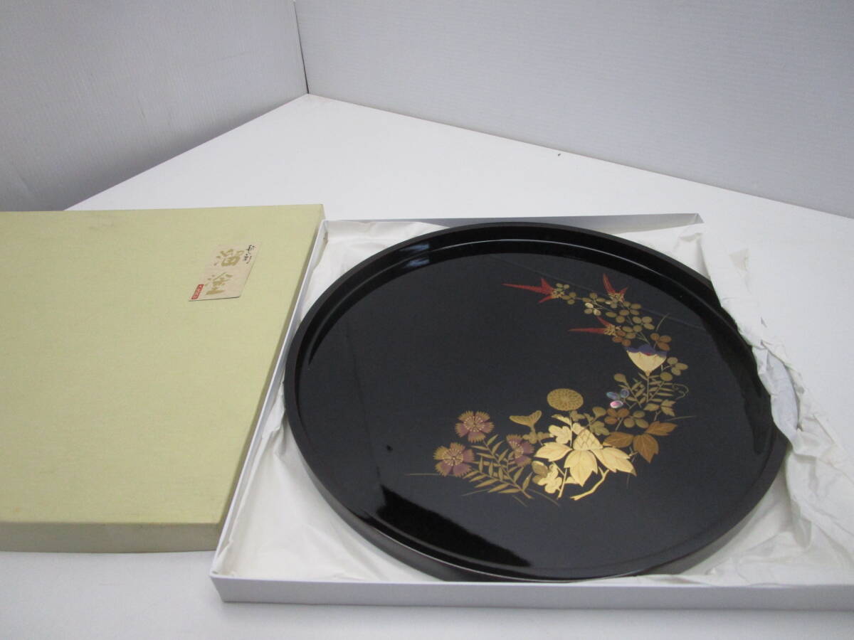 - P025★丸盆 お盆 古典 昭和レトロ インテリア 漆器 漆芸★未使用品