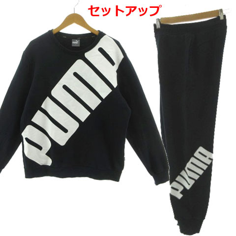 > プーマ PUMA セットアップ OVERSIZE LOGO クルースウェット スウェットパンツ 裏起毛 ストレッチ コットン混 ブラック 黒 白 XL
