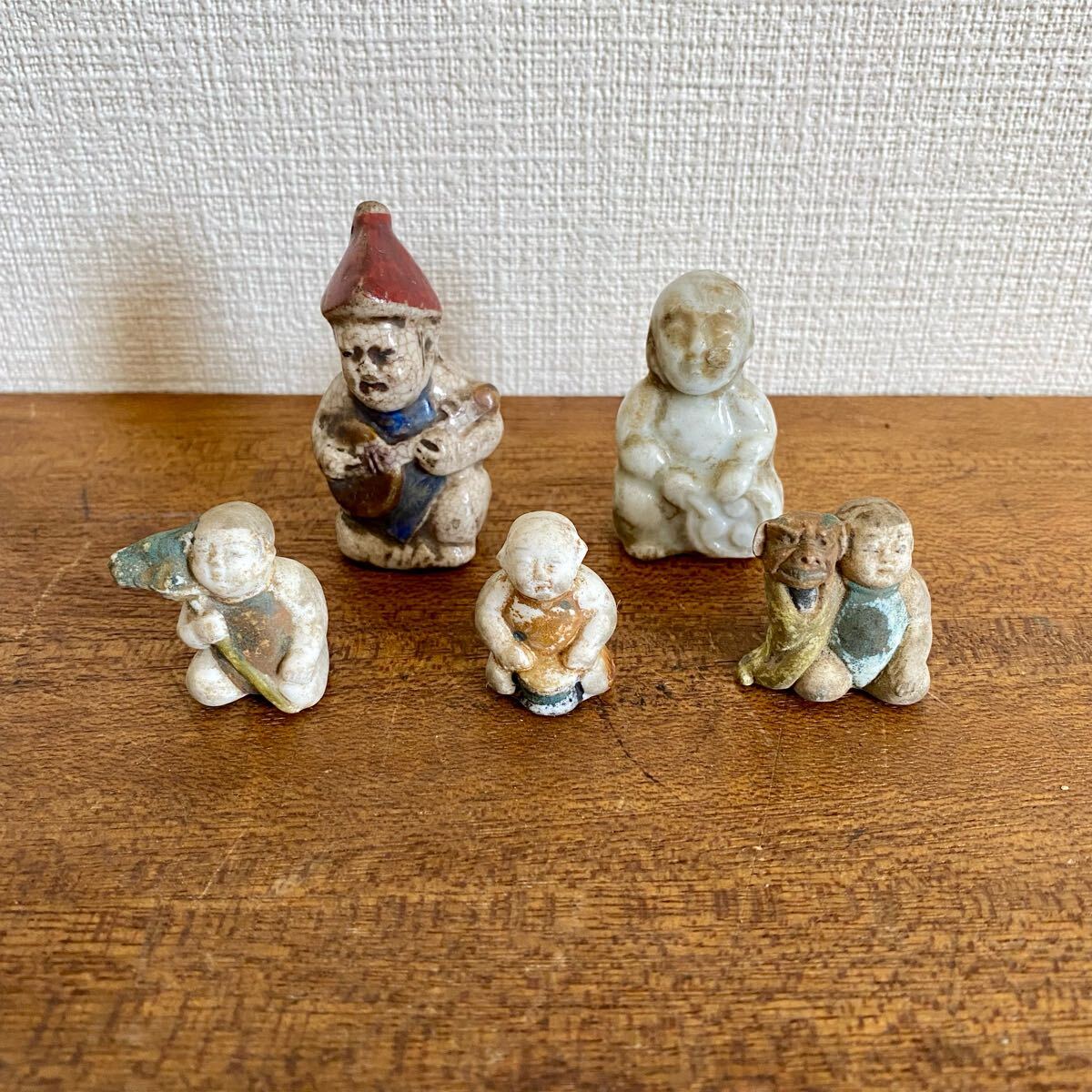 - アンティーク 土人形 陶器人形 5点セット / 豆人形 郷土玩具 置物 子供 獅子舞 大正 昭和初期
