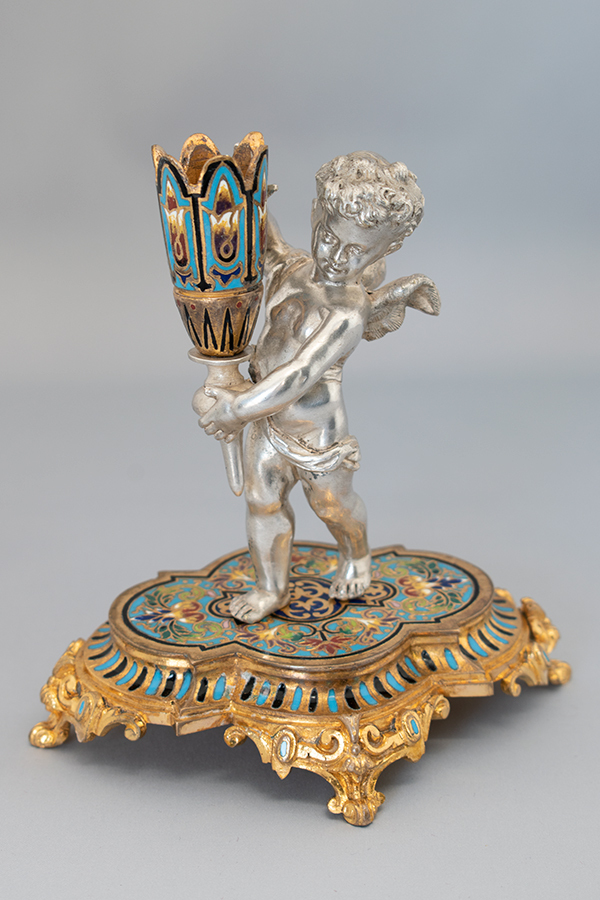 クピドーはブロンズにシルバープレート(銀メッキ)、松明や土台にはエナメル彩で鮮やかに色付けられており、その繊細な細工はいつまでも見ていられる美しさ。