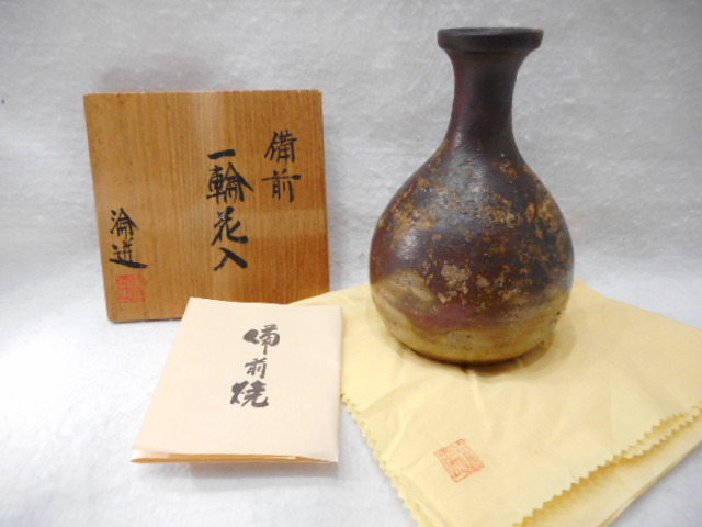 > ◇備前焼 一輪花入 淪迸作 華道具 花器 花瓶 花入れ 供布 宮宅淪迸 インテリア 保管品 共箱入り
