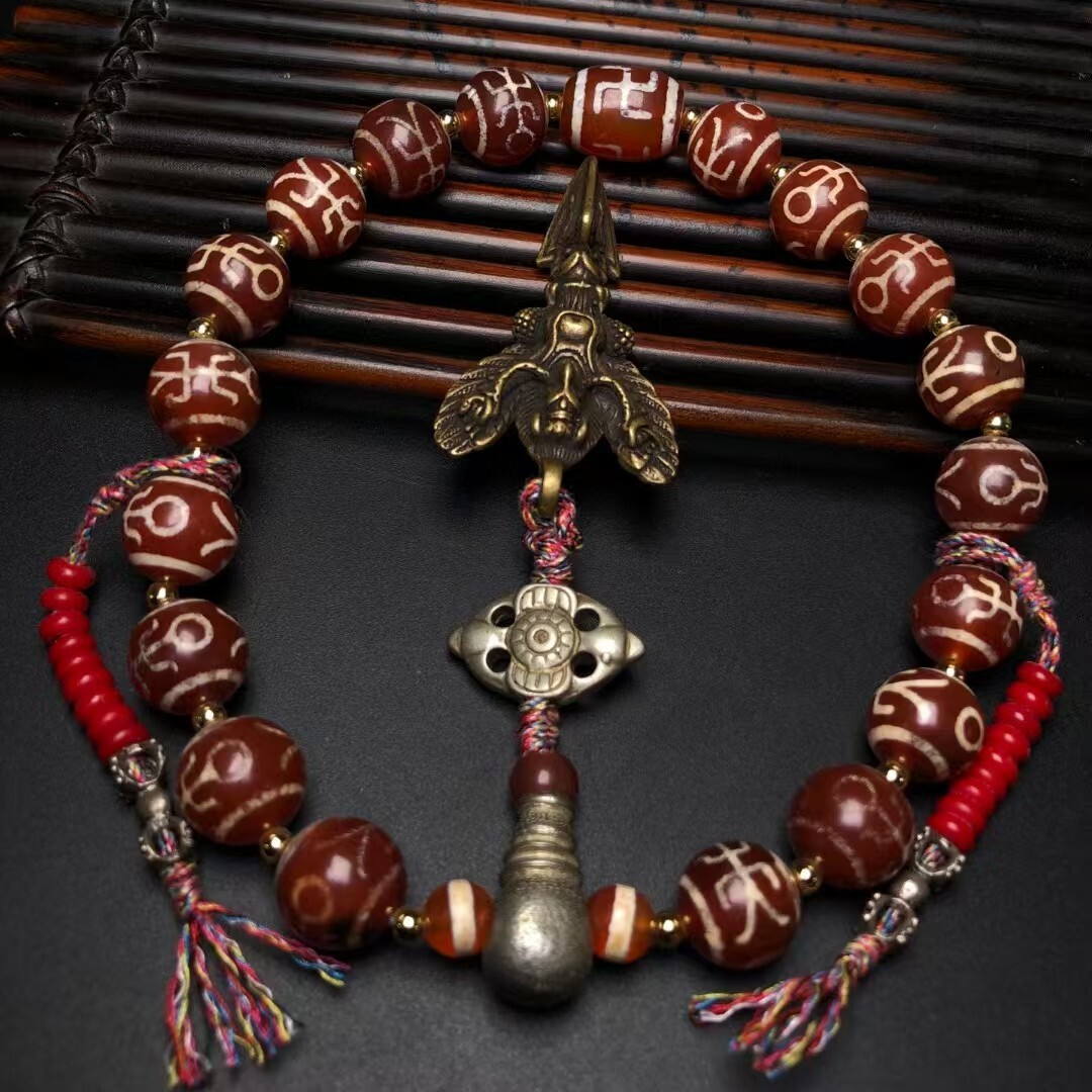 - 秘藏 清代 チベットの老天珠 高油老料 【貴人天珠と大鵬鳥十八子仏珠を組み合わせて手に持つ 】 骨董品 賞物 置物 風水 開運 辟邪 5.29
