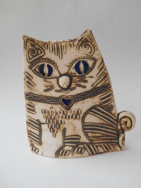 青い大きな瞳が印象的なハンドメイド、ネコの置物です。