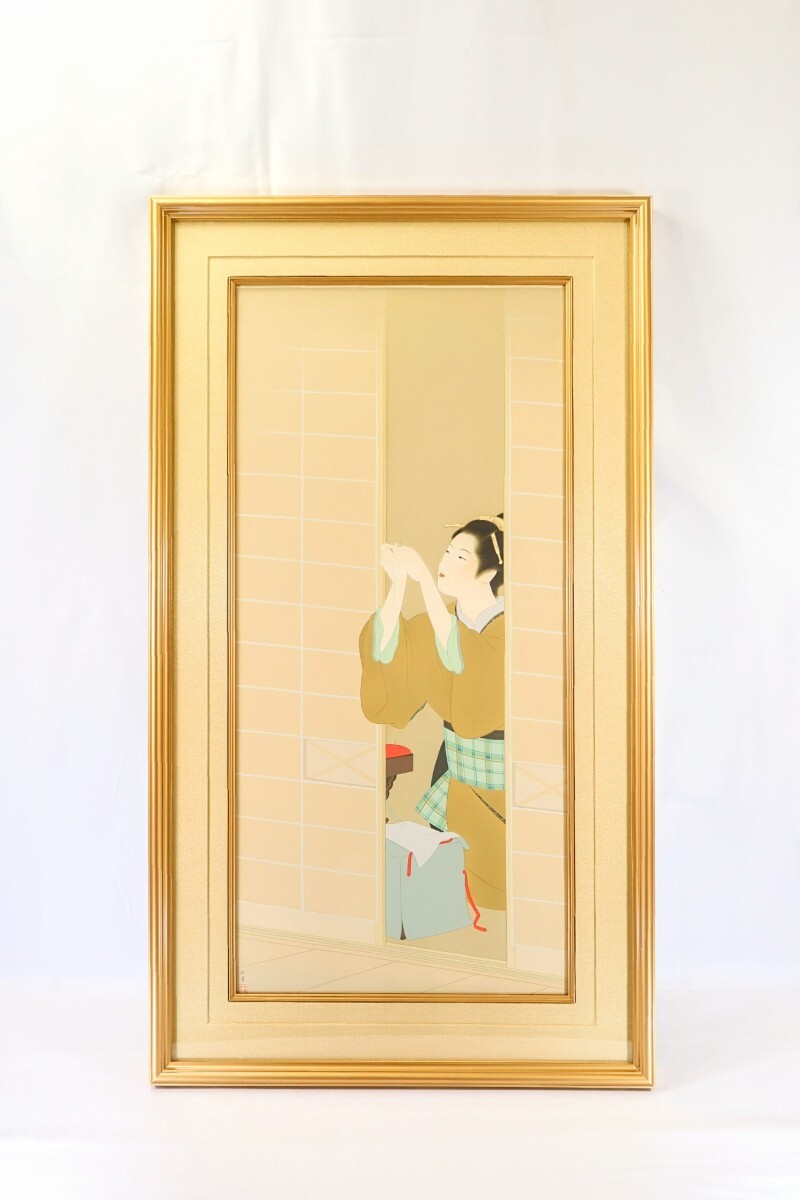 - 真作 上村松園 1999年シルクスクリーン「夕暮」画寸 42×89cm 上村淳之監修 晩年の代表作 障子をあけて外の光をたよりに針に糸を通す 10955