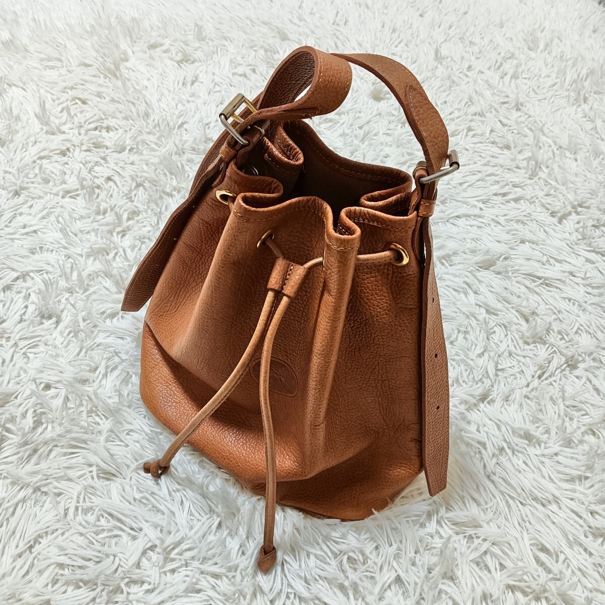 > ☆LONGCHAMP ショルダーバッグ レザーバック ゴールド金具 ライトブラウン 本革 肩掛け 斜め掛け 巾着 バケツ型鞄 ロンシャン 仏製 USED
