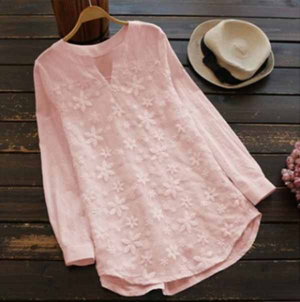 > 新入荷 * カジュアル ナチュラル ブラウス 素敵な 刺繍りレース ゆったり 大きいサイズ 長袖 シャツ オフィス 通勤 チュニック * ピンク