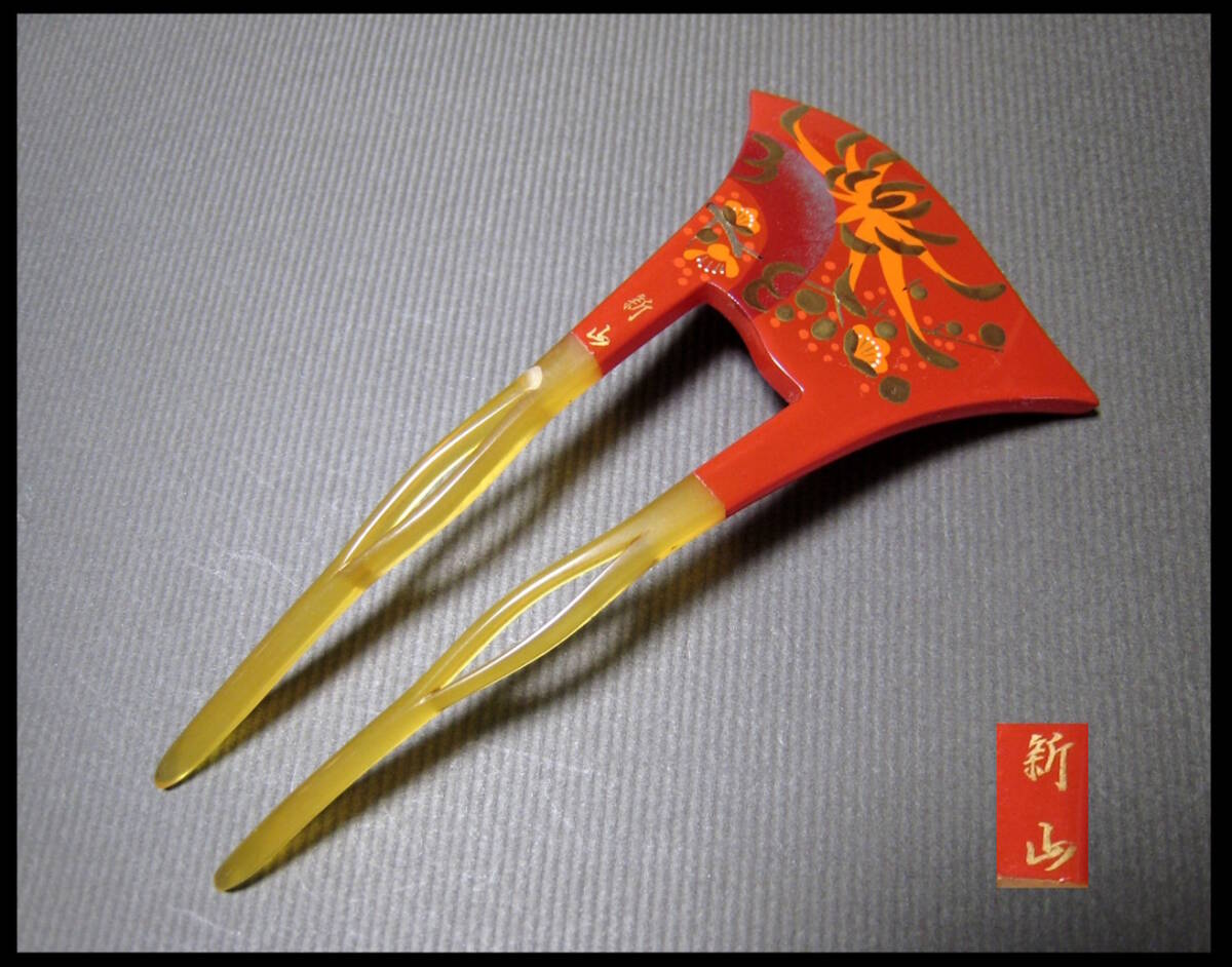 - べっこう風 菊花 梅 蒔絵 作家物 新山作 バチ簪 日本髪 和装 髪飾り 花 かんざし