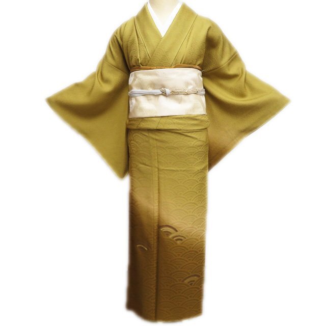 > 付下げ 付け下げ 訪問着 着物 中古 正絹 袷 地模様 青海波 暈し 箔糸 黄朽葉色 土色 金 身丈154cm 裄63cm SA きもの北條 A1204-12