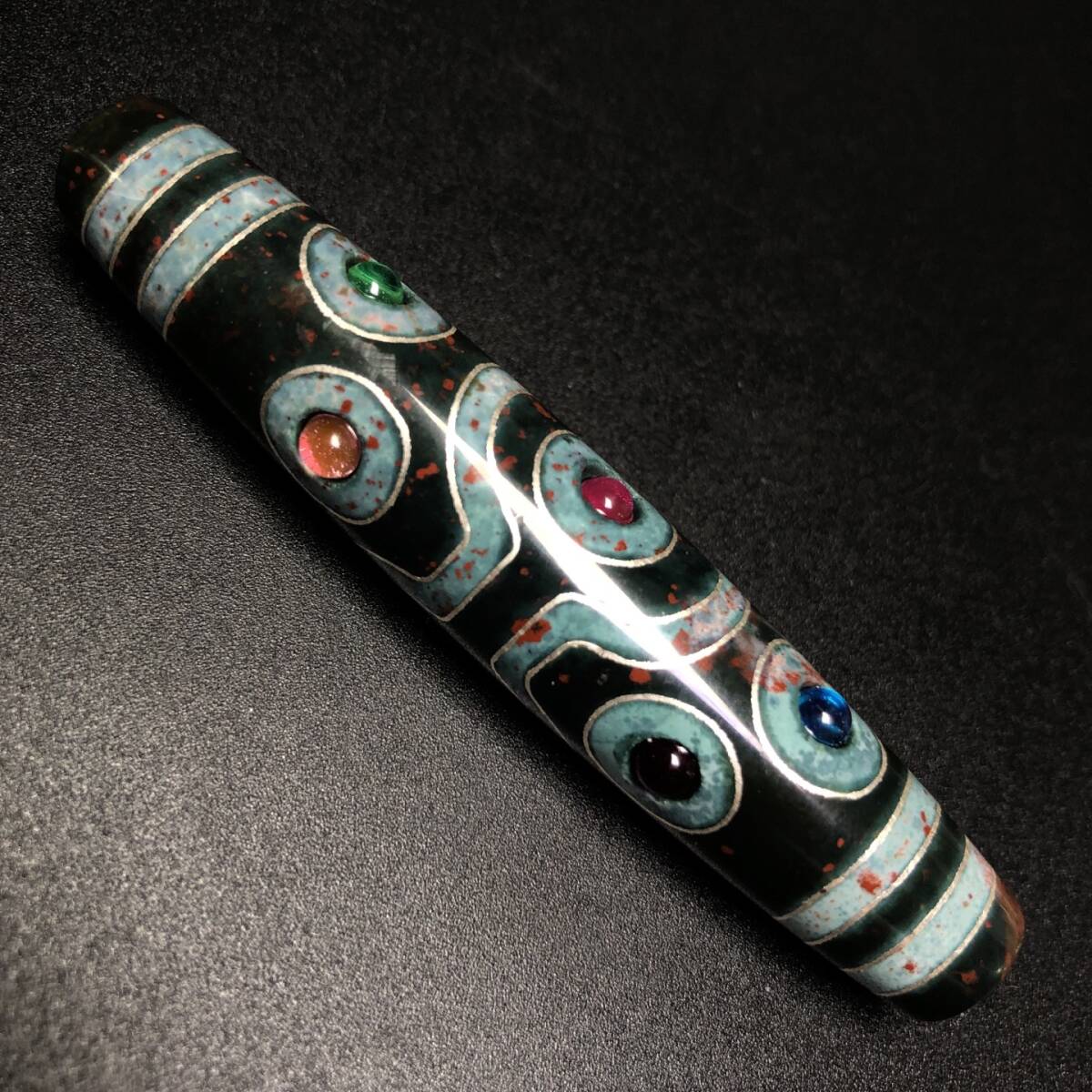 - 秘藏 清代 チベットの老天珠 高油老料 【 銀糸碧璽をちりばめた宝石満朱砂【十眼天珠】】裝身具 骨董品 風水 開運 辟邪 吊墜 挂件 玉佩6.9