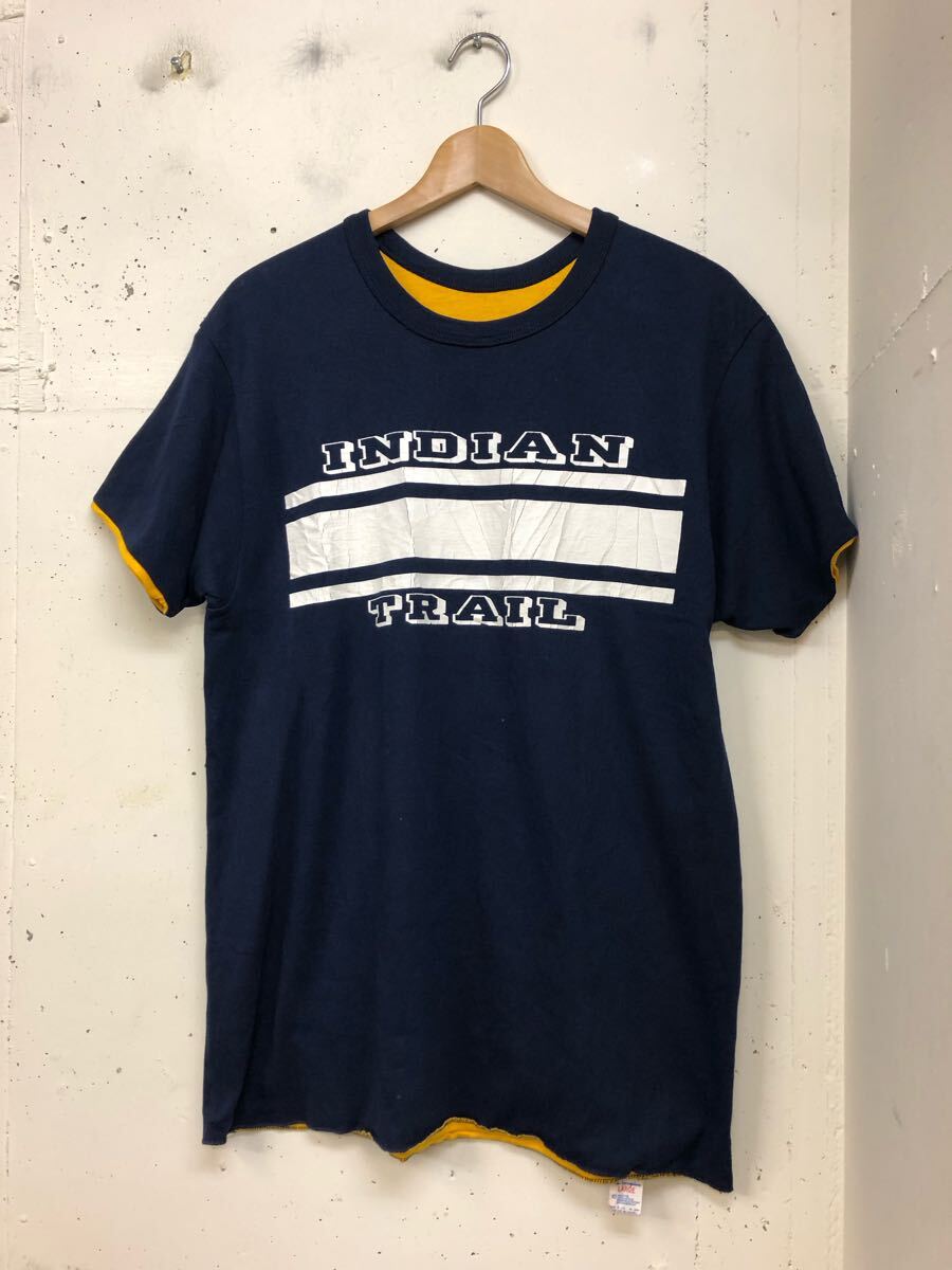 - 80s チャンピオン USA製 ダブルフェイス 半袖tシャツ L 紺 黄色 INDIAN TRAIL リバーシブル ビンテージ トリコタグ