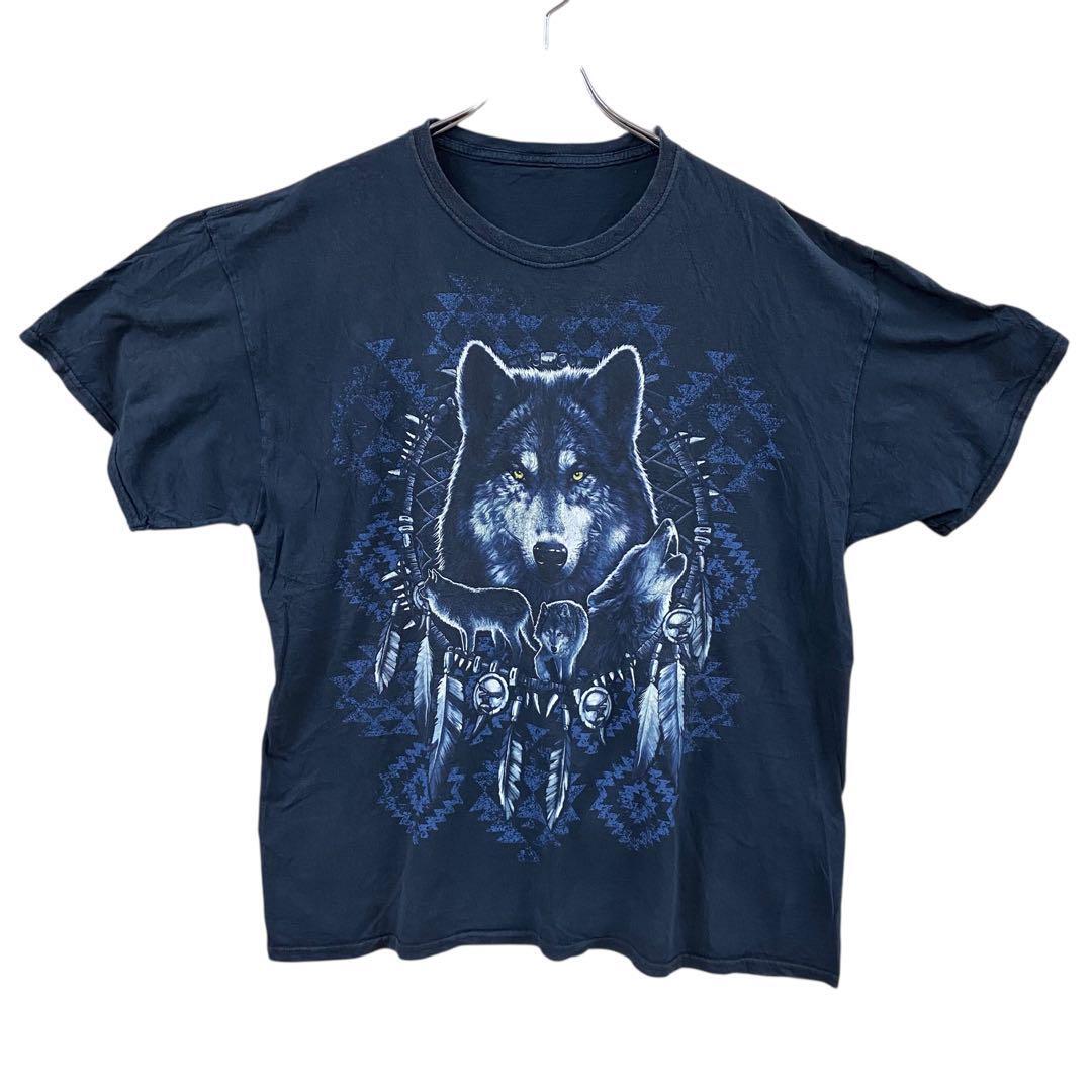 - メンズ半袖Tシャツ 黒 L 相当 アニマル柄 オオカミ ヴィンテージ【4183】