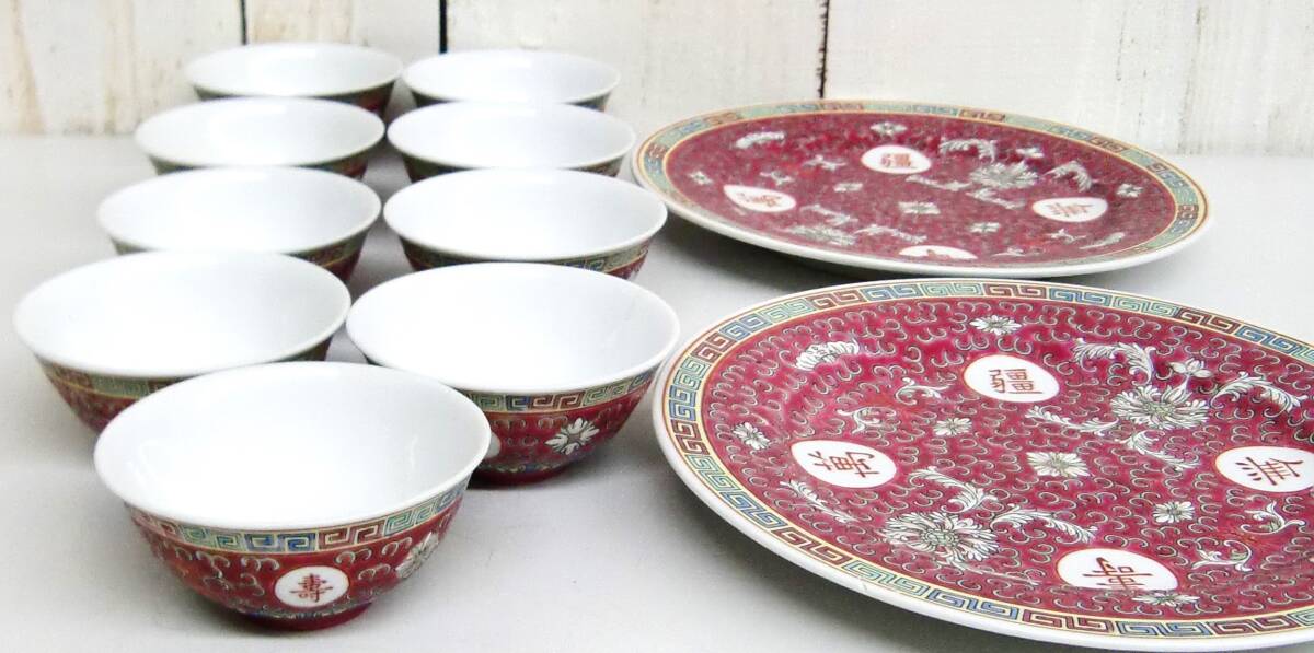 - *伝統工芸 工芸品 工芸美術 *中国景徳鎮 *11点まとめ セット *皿 2点 茶器 湯呑 9点 *萬壽無疆 赤 粉砕唐蓮花紋 *MADE IN CHINA