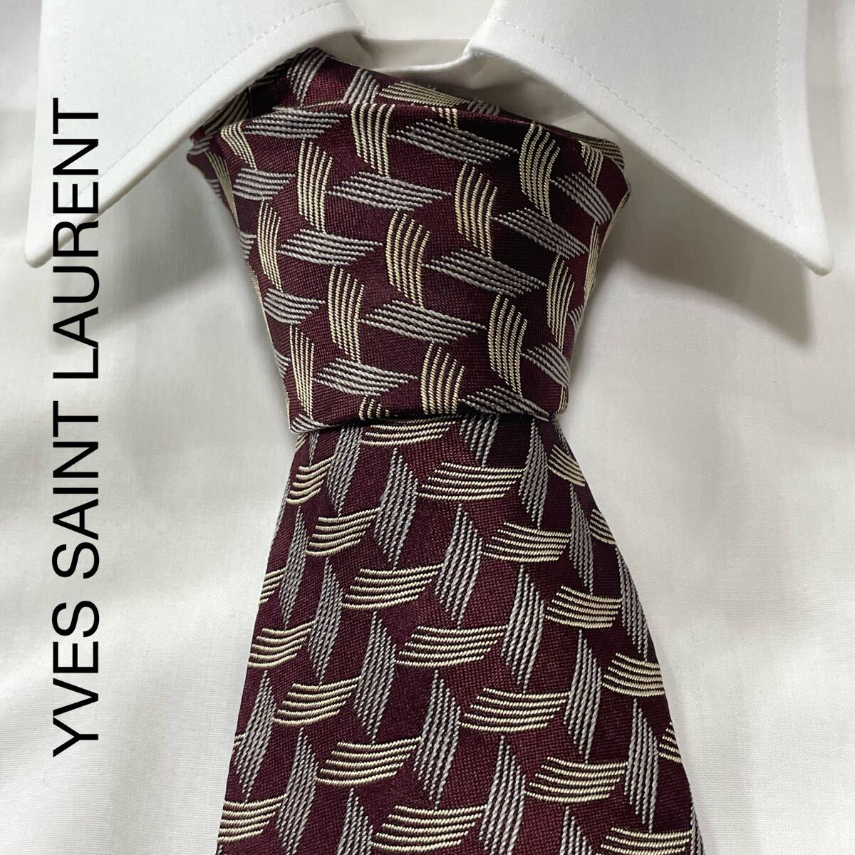 - YVES SAINT LAURENT イヴサンローラン パターン柄 ジャガード シルク ネクタイ ワイン ベージュ TG1932