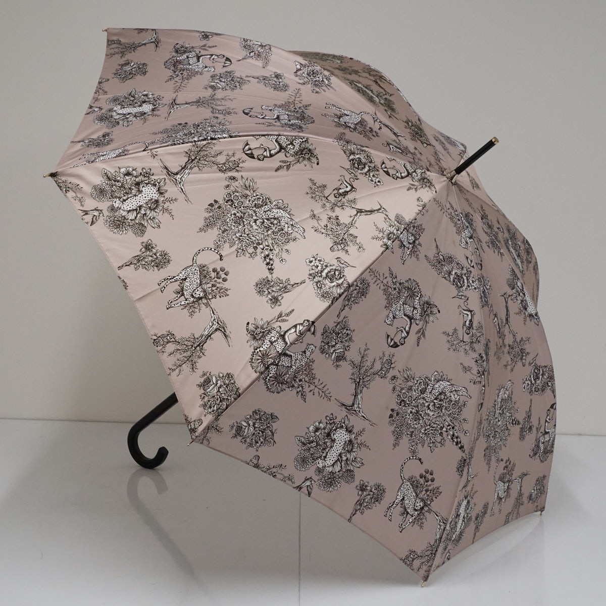 > 傘 Beaurance LX ビューランス USED美品 オリジナルプリント アニマル フラワー ベージュ 木製手元 グラス骨 60cm S2672