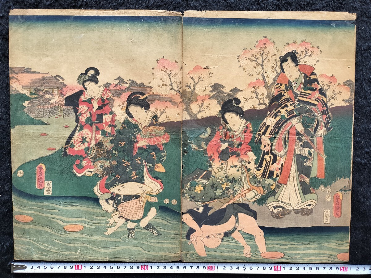- 【真作】本物浮世絵木版画 歌川豊国「曲水遊覧之図」江戸期 美人図 錦絵 大判 二枚続 保存良い