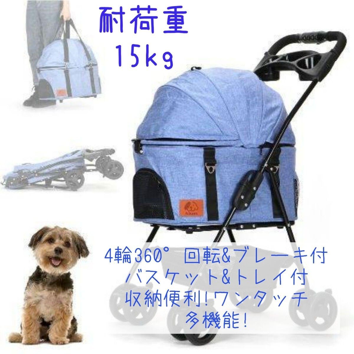 > ペットカート 分離式 ブルー系 4輪360°回転 折りたたみ 猫犬兼用 軽量 コンパクト 取り外し可能 飛び出し防止 耐荷重15kg 多機能