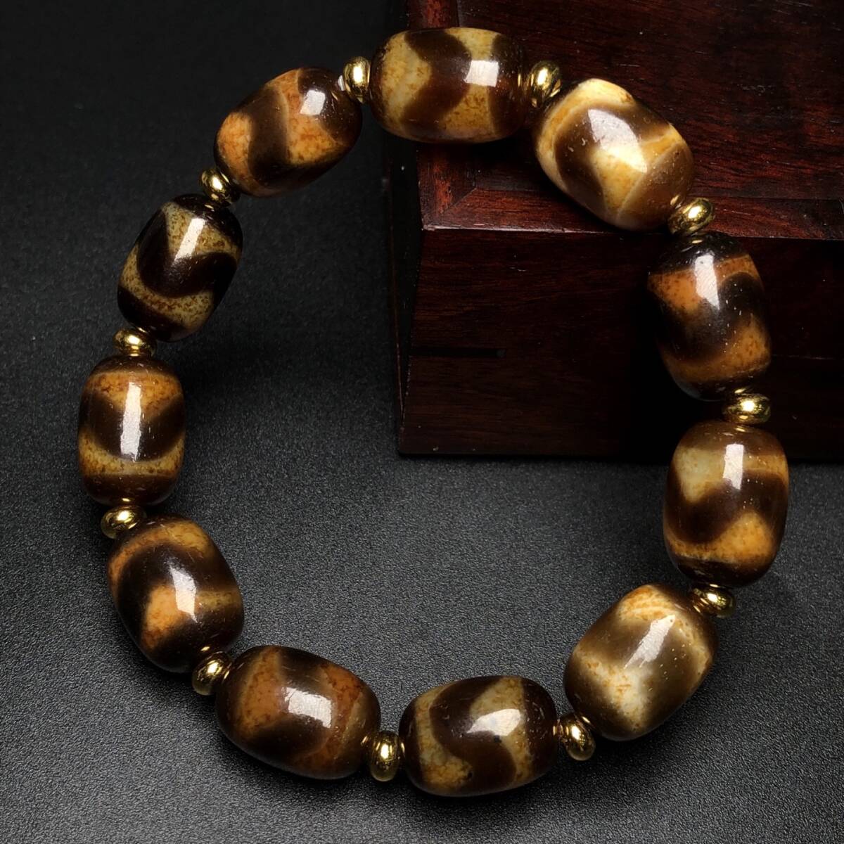 - 多宝閣■ 202161 和田玉【オールドタイガートゥースDziビーズブレスレット】 印章 彫刻品 珍品旧蔵 伝世家珍 極上珍品 孤品