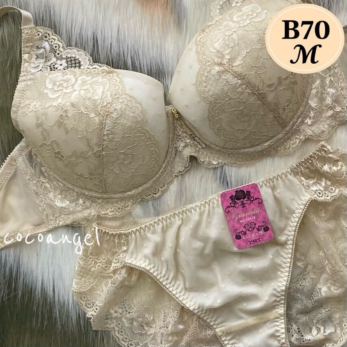 - ラスト【B70/M アイボリー】新品 ブラジャーショーツ パッド付き ドット柄&レース 透けパンティ かわいいブラ 小さいサイズ Bカップ