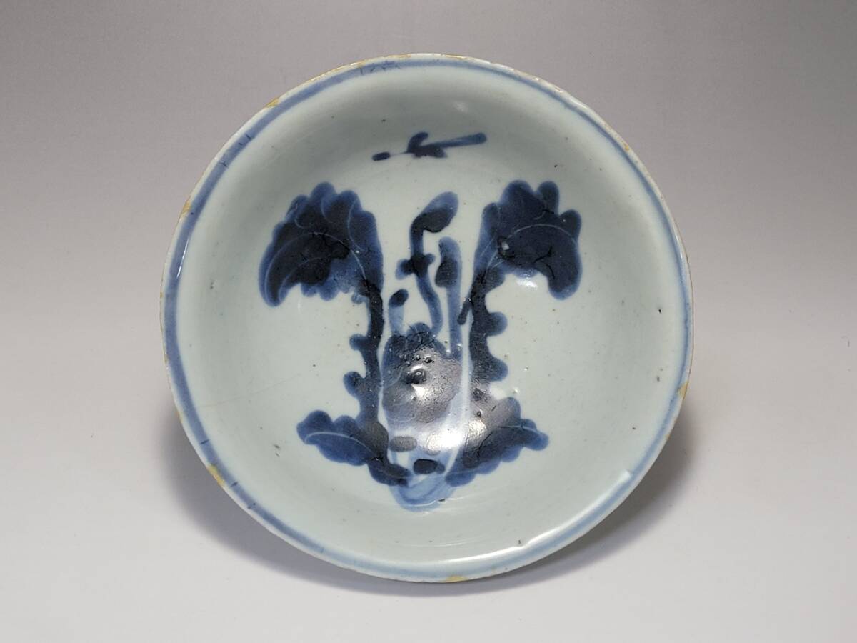 > ● 幅 約 15cm 碗の内部に描かれた草紋がきれいな 時代唐物 染付 草紋 碗・元明時代 茶碗 煎茶道具 茶道具 茶器 唐物 人間国宝 李朝 ●