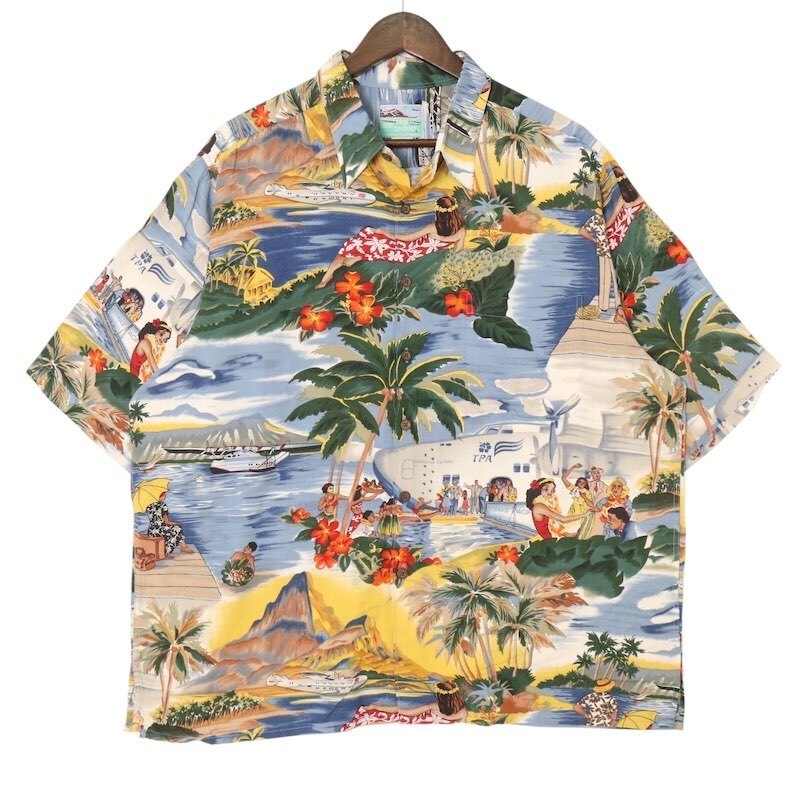 > 90's レインスプーナー 半袖ハワイアンアロハシャツ メンズUS-2XLサイズ相当 総柄 ブルー系 sc-0620n