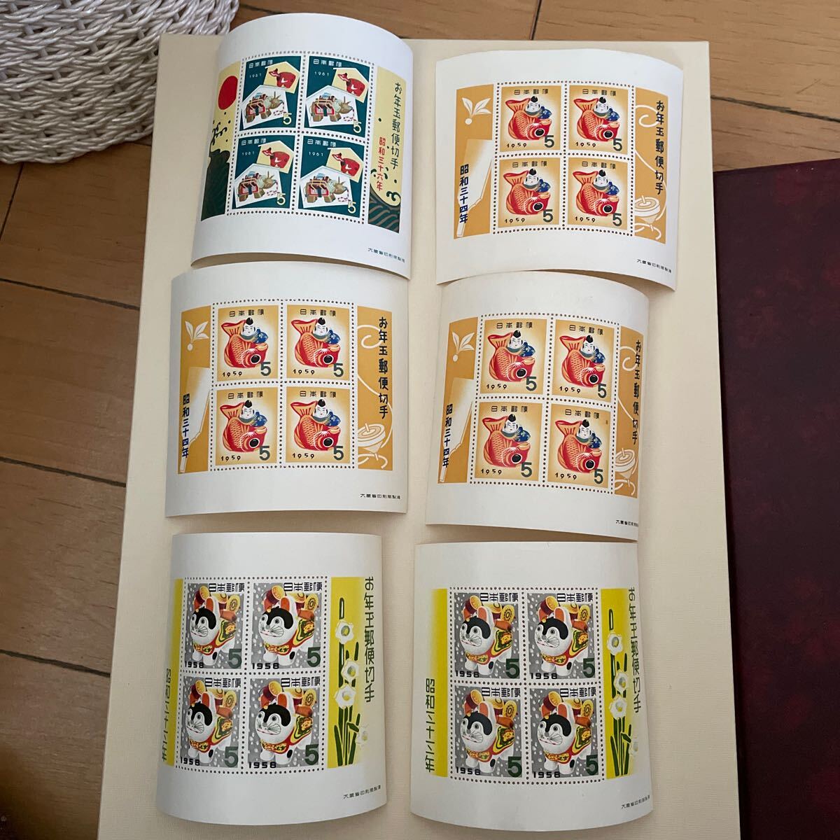 - レトロお年玉郵便切手 各種6枚 ハリコ、 鯛えびす他