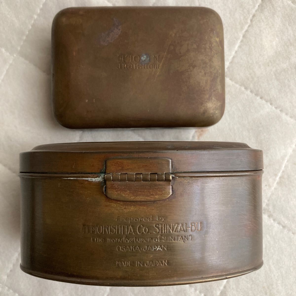 - 大正時代.昭和時代初期のレトロな歯磨き粉入れ.I IMORISMITA.Co.S MINAI-BU.石鹸入れ.NICOLE.mOnSIeuL.材質は真鍮製.純正.稼働品.完品.