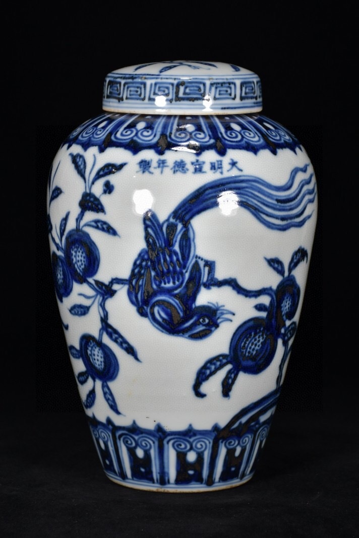 - 蔵友旧蔵出 明 宣德年製款 青花 鳳戲果實紋 蓋瓶 稀少珍品 貴重品 古陶瓷品 置物 古賞物 中国古玩 中国古美術品
