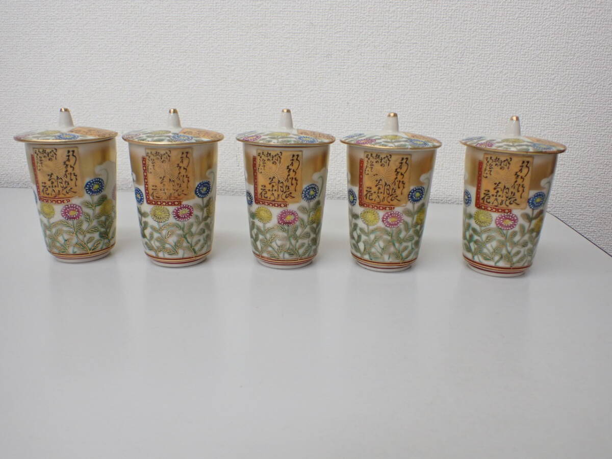 - 陶磁器-96; 九谷焼 柏翠 蓋付き 湯呑茶碗 5客揃 高さ;約10.5×径;6.6cm(蓋付きで) ★