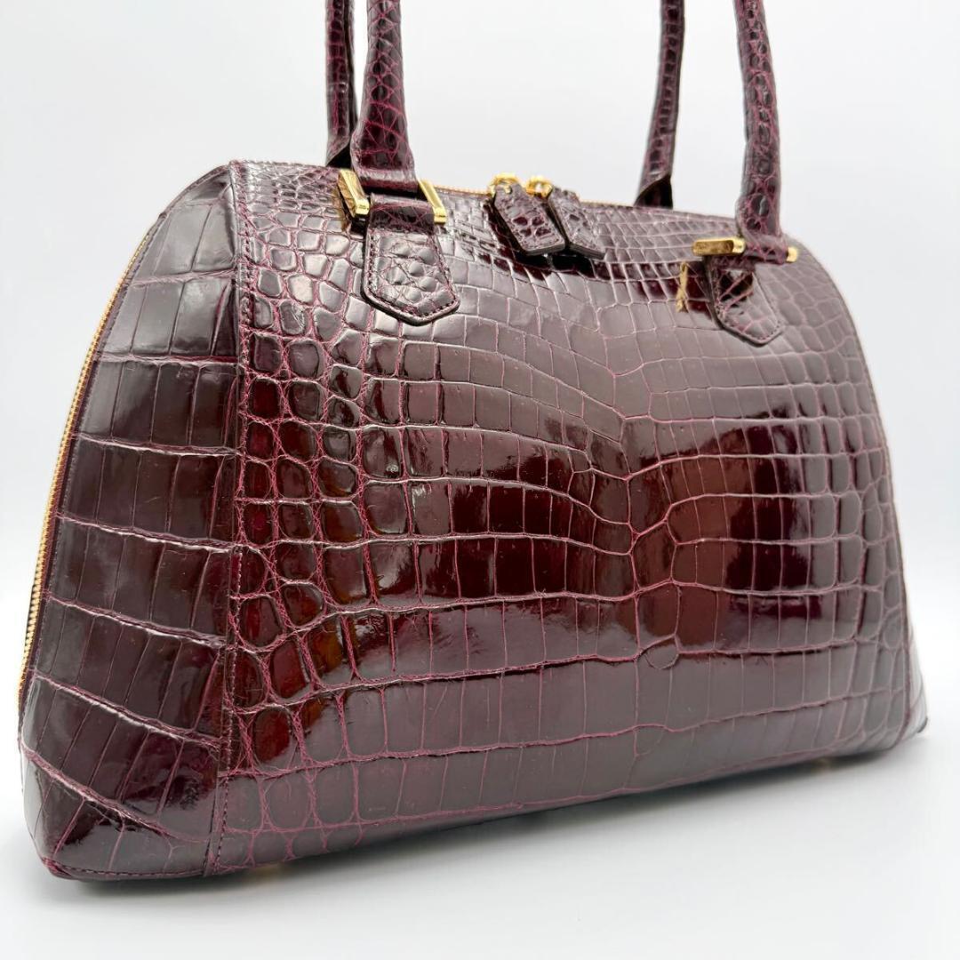 > 美品 SANPO/三宝/サンポー シャイニングクロコダイル ハンドバッグ JRA認定 ボルドー 本革 リアルレザー ワニ革 エキゾチック センター取り