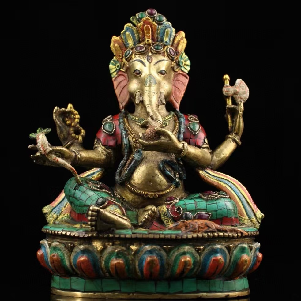 - 仏像 清代 旧蔵 チベット古寺 古銅象嵌宝石彩色蒔絵蒔絵蔵伝密宗象鼻財神 銅製 銅琉金 唐物 收蔵品 時代物 古置物 供養品 文房具 仏教6.26