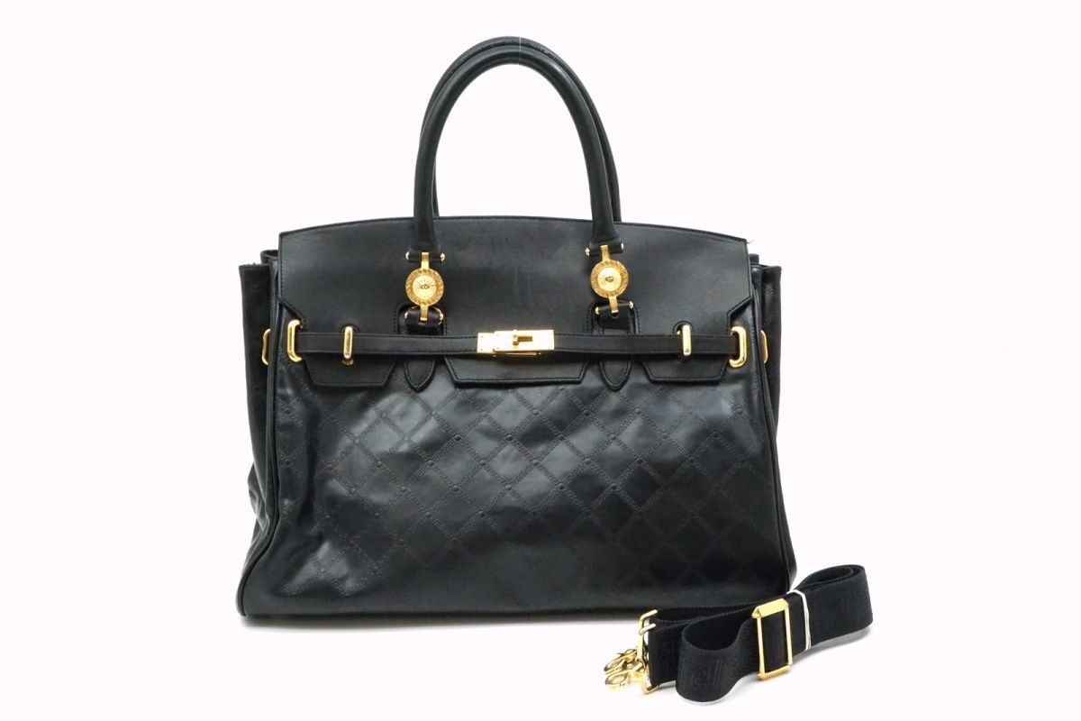 > ジャンニ ヴェルサーチェ ヴィンテージ 2way ショルダー バッグ トート サンバースト グレカ PVCレザー 黒 ブラック GIANNI VERSACE 2645h