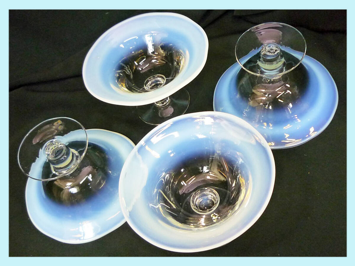 > 旧家蔵出 激レア 大正ガラス 骨董 当時物 氷コップ デザートカップ 乳白青線 4個セット 乳白色 手作り 吹き硝子 大正ロマン昭和レトロ気泡