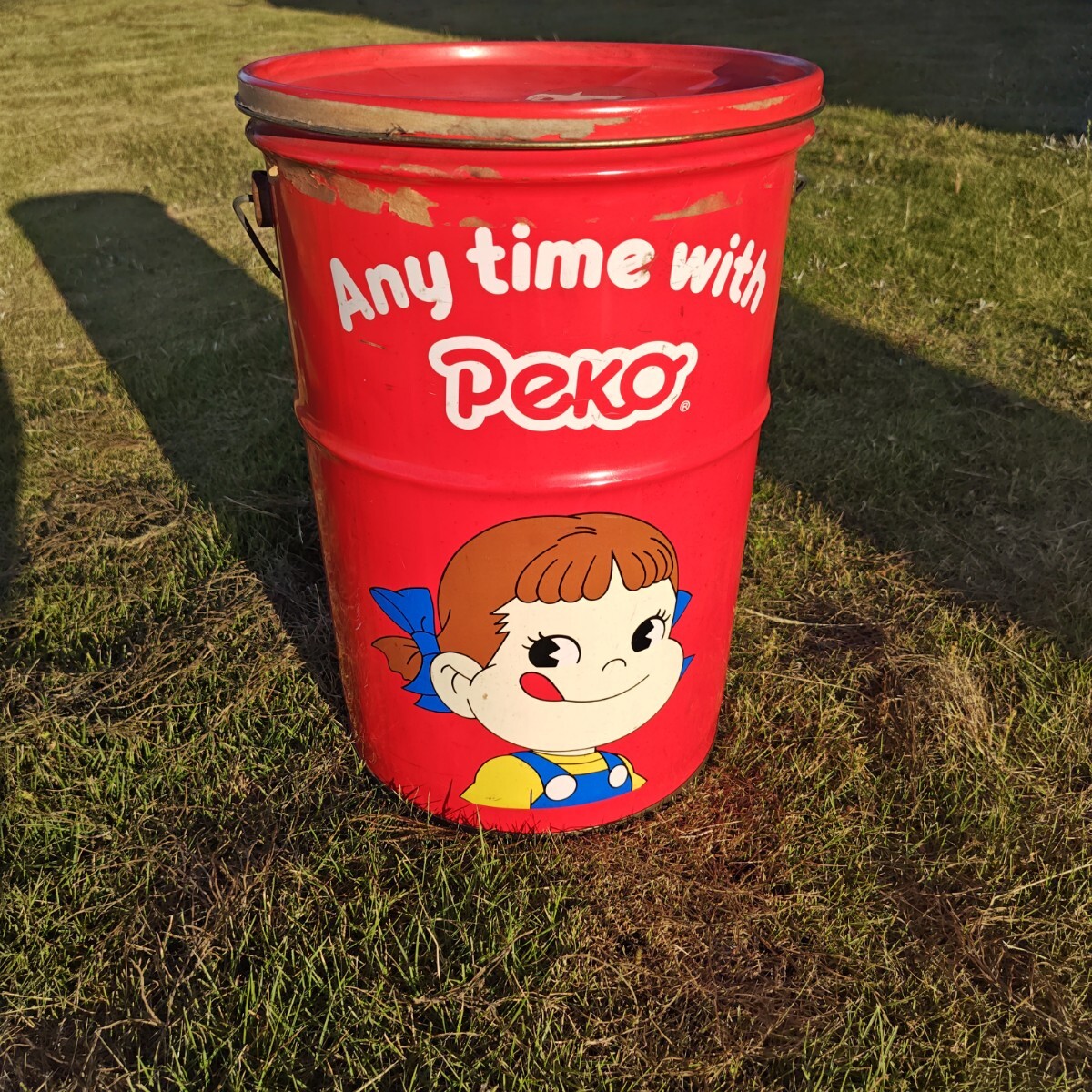 - ペコちゃん イラスト付き缶大きめ インテリアや収納、ゴミ箱等色々使えます 不二家 当時物 レトロ