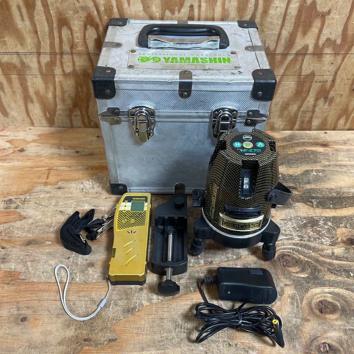 - YAMASHIN 山真 レーザー墨出し器 GLZ-4+ グリーンレーザー 限定色 ゴールドカーボン 受光器 BBR-GLZ-GC ケース付 光学測定器 中古品☆郵