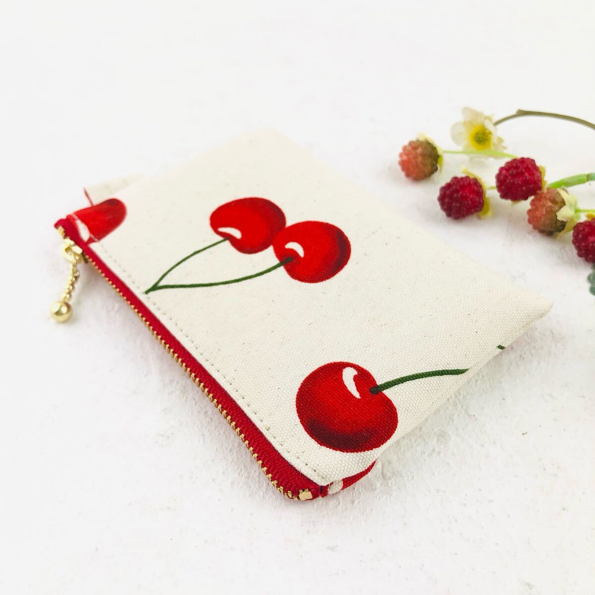 - さくらんぼのカードポーチ フラットポーチ カードケース ハンドメイド 小物入れ コインケース サクランボ