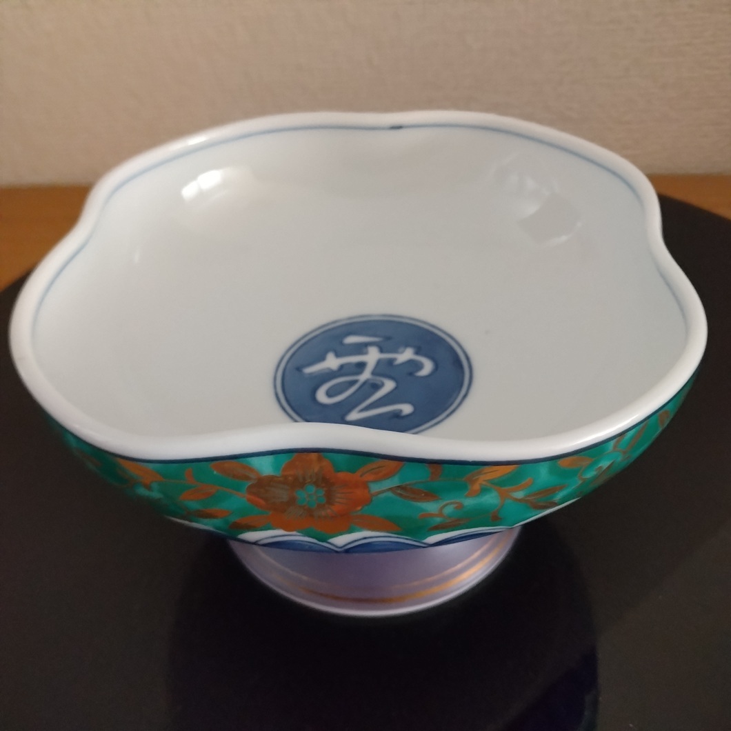 - 日峰窯 高台中盛鉢 雲文字あり 和食 刺身 手描き 金彩 緑 青 紫