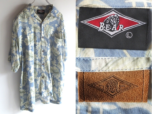 > 希少 ビンテージ BEAR USA ベアー 花柄 フラワー柄 ココナツ釦 半袖 開襟 ボックス レーヨン アロハシャツ L ライトブルー ネコポス対応