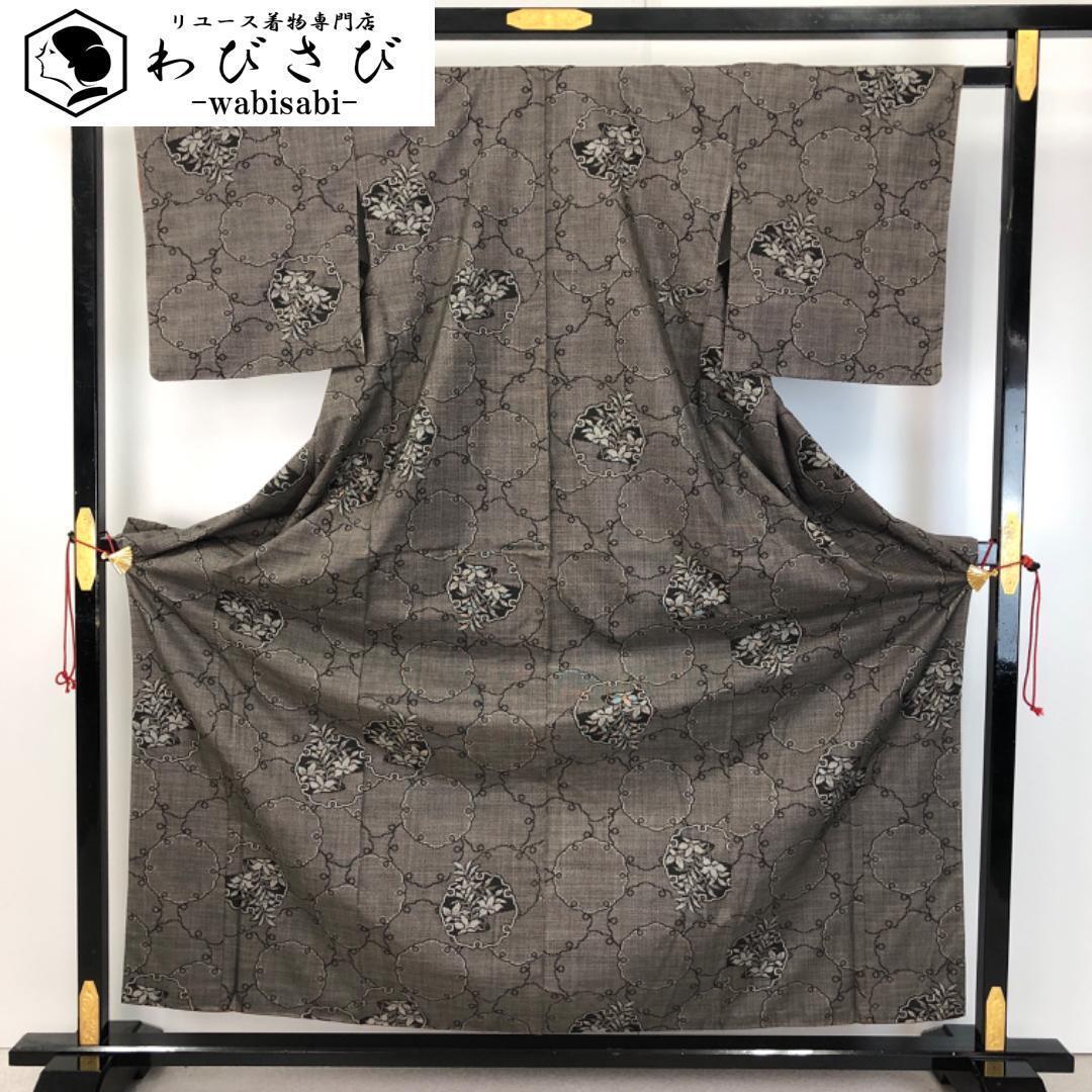 > 本場大島紬 茶泥染 一元7マルキ 雪輪に花模様 K-4951 着物 きもの kimono 和服 和装 中古 リサイクル着物 【送料無料】