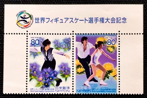 - [25062816]【世界フィギュアスケート選手権大会記念】2種連刷 タイトル付「男子シングル りんどう ペア 福寿草」80円×2 2002年発行 美品