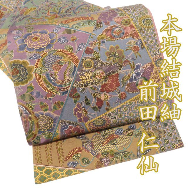 - 袋帯 中古 リサイクル 正絹 カジュアル 全通 本場 結城紬 ラベル付き 友禅師 前田仁仙 落款 花鳥模様 多色 金 きもの北條 A1224-12