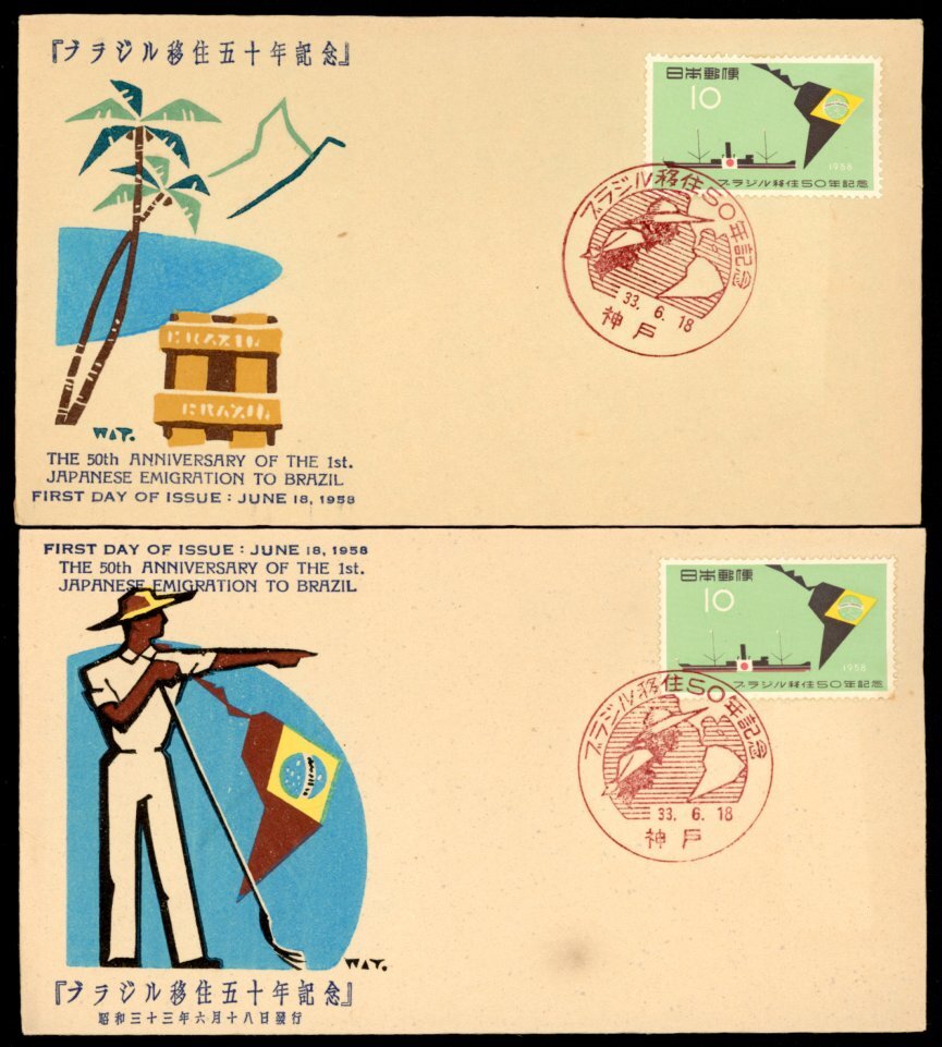 - 0562 【FDC】ブラジル移住50年記念 カシェ違い2通[神戸/33.6.18/松屋版]