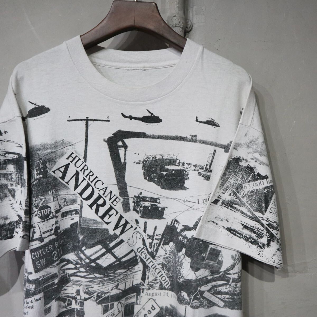> 【即決】90s ANDREW 総柄 プリント Tシャツ モノクロ 白黒 ホワイト ブラック ハリケーン アンドリュー シングルステッチ 古着