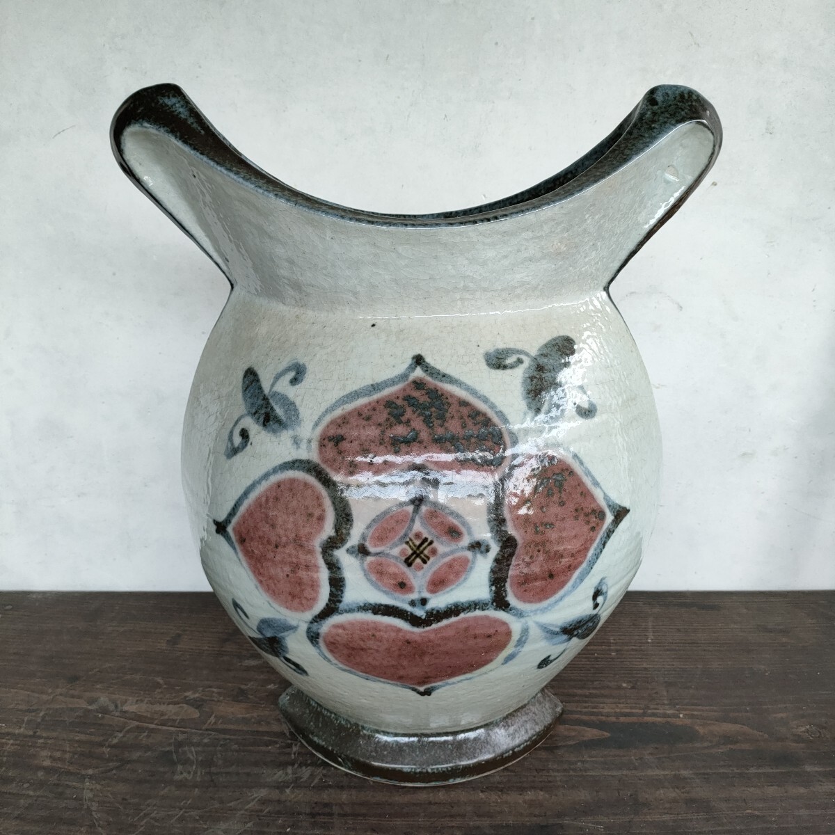 - 京都名工 河井透作 呉洲辰砂花紋大扁壺 銘あり 高さ約41cm師匠は人間国宝辞退の河井寛次郎 大花瓶花入花器京焼 民藝民芸 壺 箱無し伝統工芸